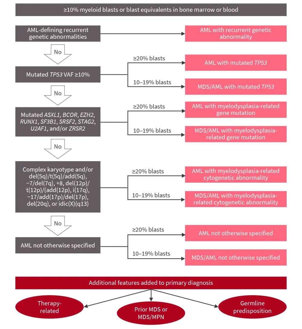 Currently, genetic abnormalities define the classification of AML disease within the International Consensus Classification of AML, with additional features as qualifiers of the primary diagnosis (Figure 1).