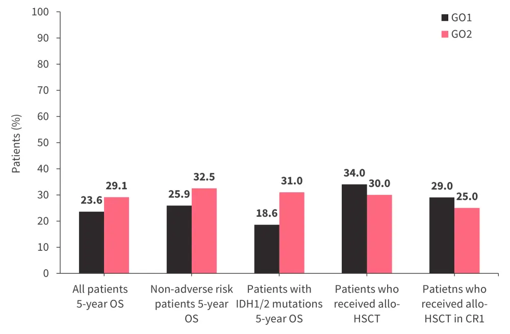 Allo-HSCT, allogeneic hematopoietic stem cell transplantation; CR1, first complete remission; GO1; gemtuzumab ozogamicin single dose; GO2, gemtuzumab ozogamicin fractionated dose; OS, overall survival.