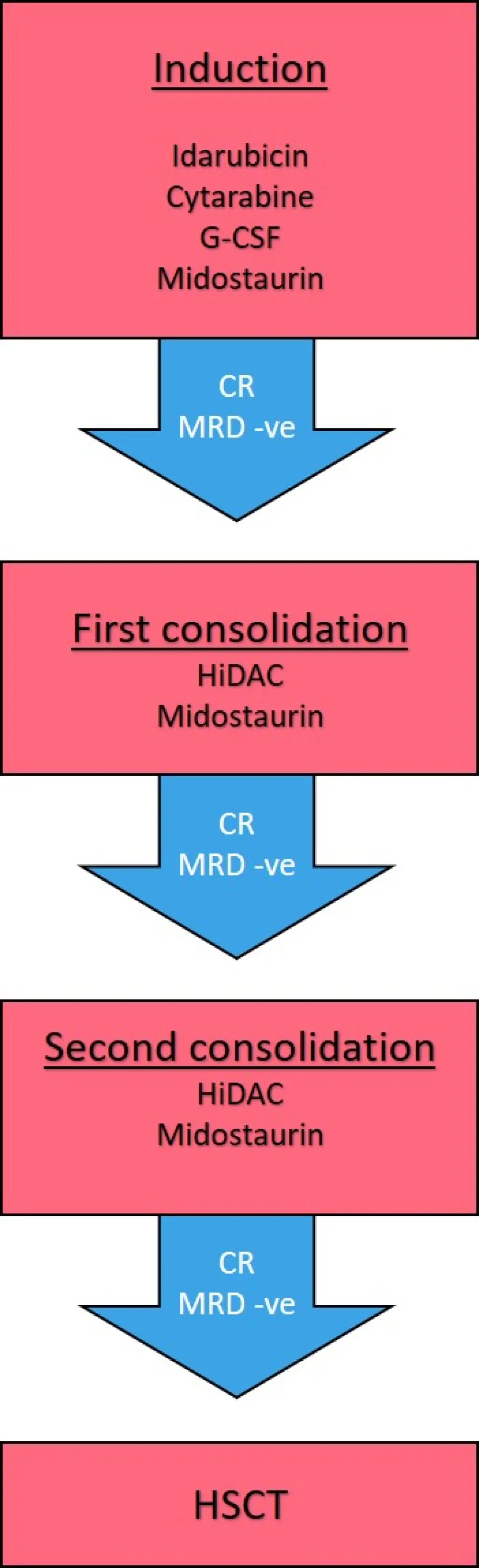 CR, complete remission; G-CSF, granulocyte-colony stimulating factor; MRD -ve, minimal residual disease negativity; HiDAC, high dose cytarabine; HSCT, hematopoietic stem cell transplant