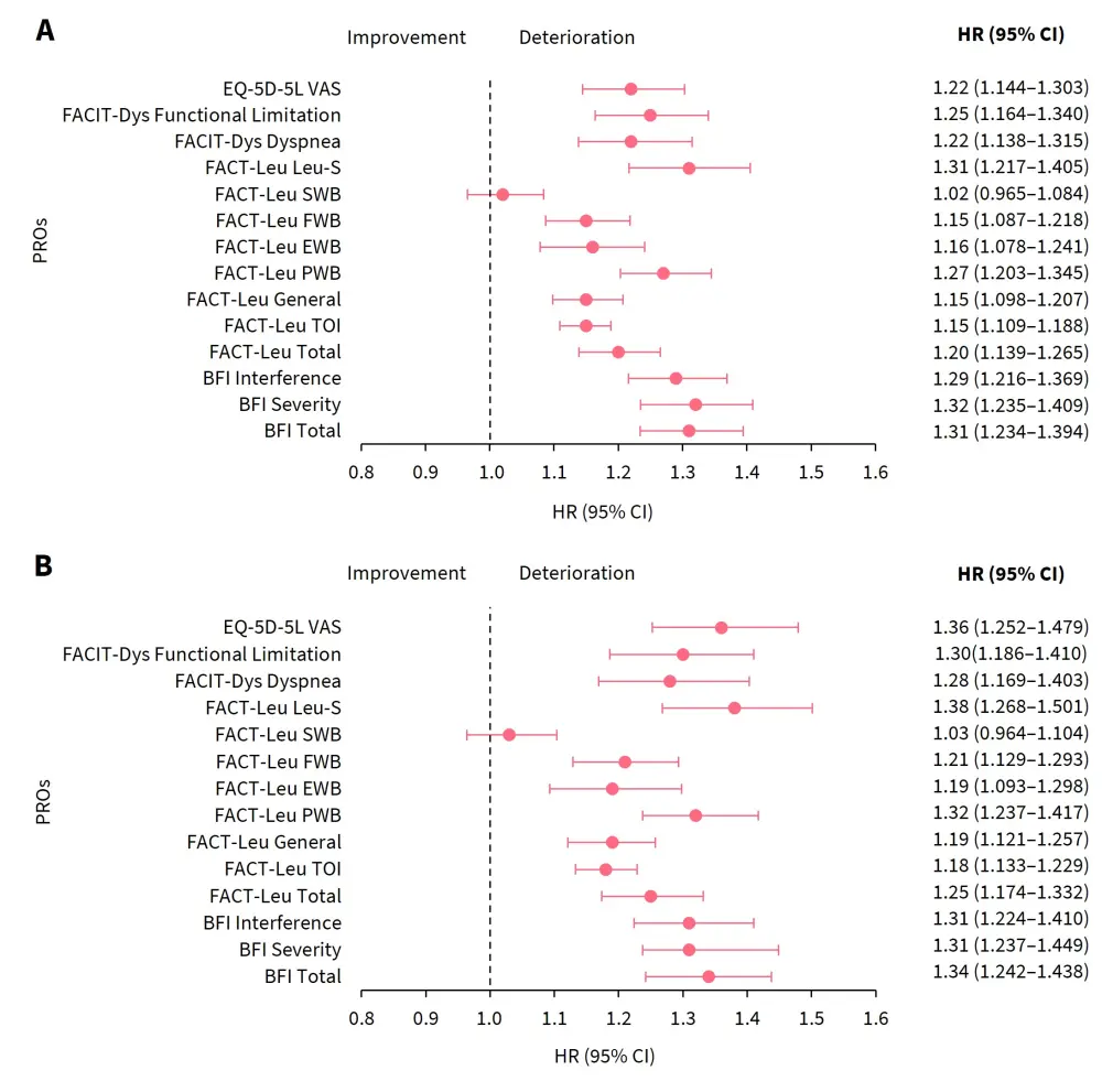 BFI, Brief Fatigue Inventory; CI, confidence interval; EWB, emotional well-being; EQ-5D-5L, EuroQoL 5-Dimension 5-level; FACIT-Dys, Functional Assessment of Chronic Illness Therapy-Dyspnea; FACT-Leu, Functional Assessment of Cancer Therapy-Leukemia; FWB, functional well-being; HR, hazard ratio; ITT, intention to treat; Leu-S, leukemia subscale; PRO, patient-reported outcome; PWB, physical well-being; SWB, social/family well-being; TOI, trial outcome index; VAS, Visual Analog Scale.