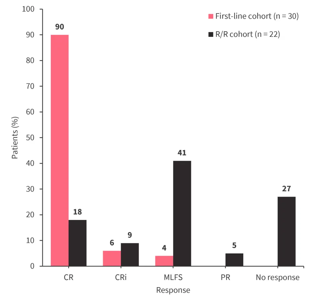 CR, complete remission; CRi, CR with incomplete hematologic recovery; MLFS, morphologic leukemia-free state; PR, partial remission; R/R, relapsed/refractory.