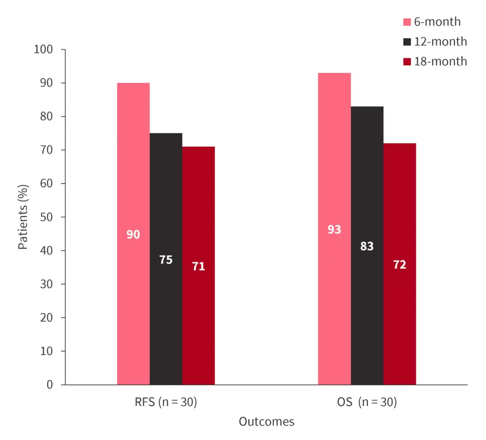 Figure 2. 6-, 12-, and 18-month RFS and OS rates in the first-line cohort*