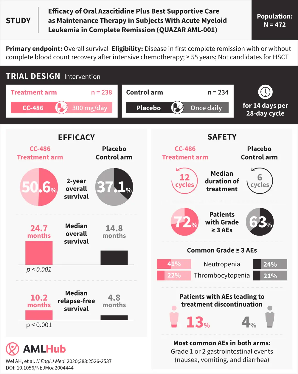 Effective AML maintenance therapies are required when HSCT is not feasible and should reduce the risk of relapse while maintaining patient health-related quality of life. The oral formulation of azacitidine, CC-486, was approved as a maintenance therapy by the U.S Food and Drug Administration (FDA) in September 2020. The approval was based on the results of the phase III QUAZAR AML-001 trial (NCT01757535), evaluating maintenance with CC-486 vs placebo in patients aged ≥ 55 years with AML in first remission. Topline results showed that maintenance with CC-486 resulted in significantly improved overall survival (OS; the primary endpoint) and relapse-free survival (RFS; a secondary endpoint) vs placebo in the elderly AML setting.