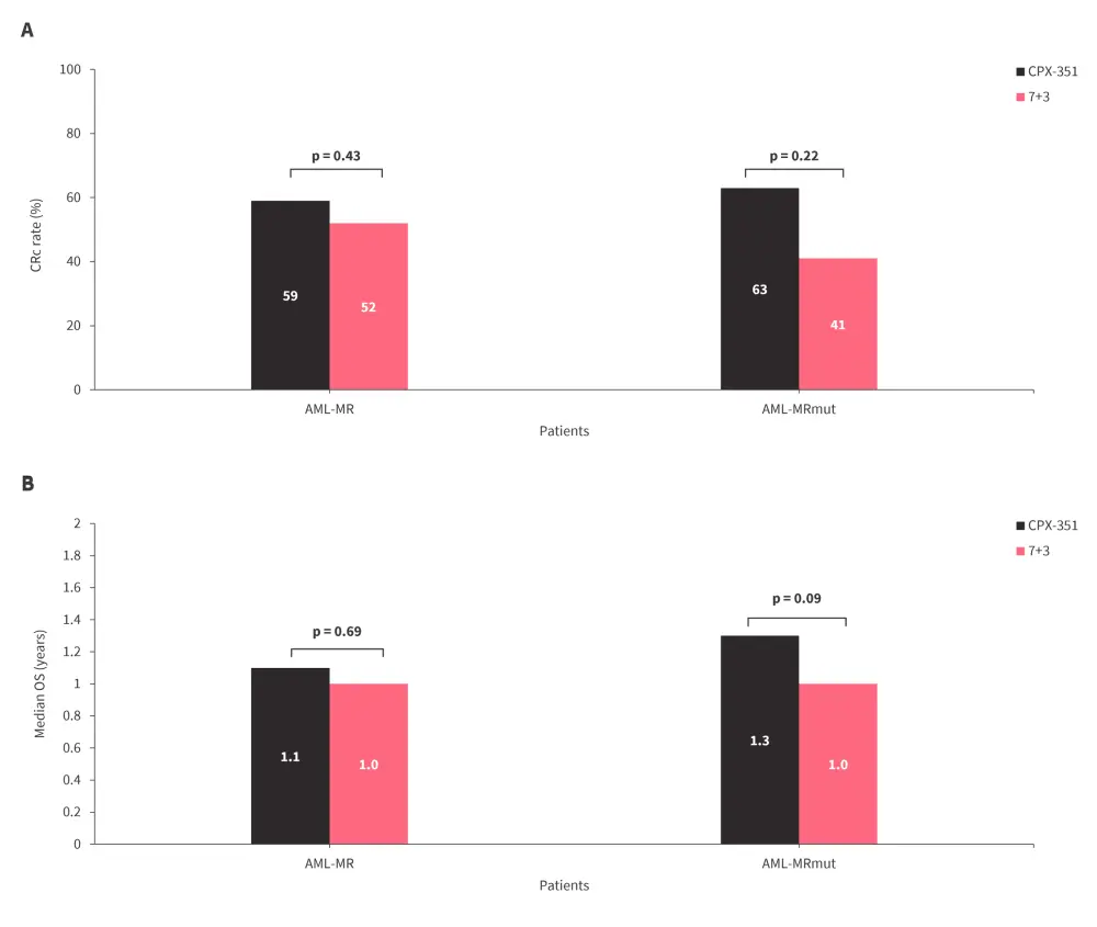 Figure 4. Comparison of A CRc rates and B median OS in patients with AML-MR and AML-MRmut treated with CPX-351 vs 7+3 chemotherapy*