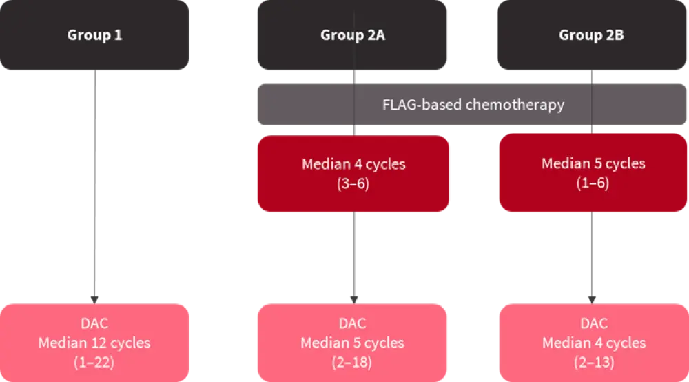DAC, decitabine; FLAG, fludarabine, cytarabine, and granulocyte-colony stimulating factor.
