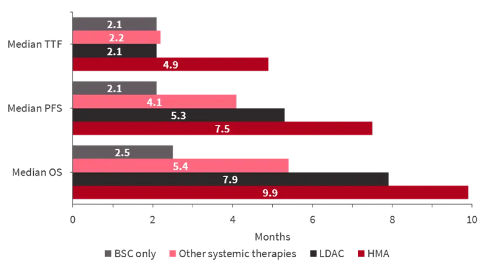BSC, best supportive care; HMA, hypomethylating agent; LDAC, low-dose cytarabine; OS, overall survival; PFS, progression-free survival; TTF, time-to-treatment failure.