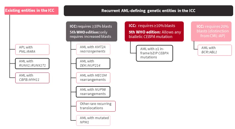 The recurrent AML-defining genetic entities listed in the ICC classification, and how they differ from the 5th WHO classification, are shown in Figure 2.