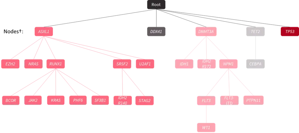 †Each node represents a gene mutation, and each branch describes the evolution of different possible pathways of leukemogenesis by inferring the sequence of mutation acquisition.