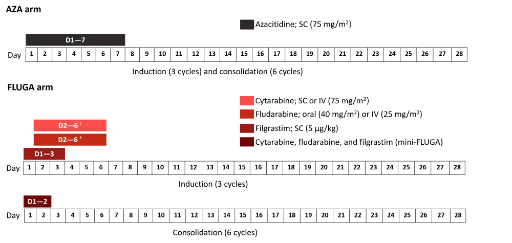 AZA, azacitidine; D, day; FLUGA, fludarabine, cytarabine, and filgrastim; IV, intravenous; SC, subcutaneous.