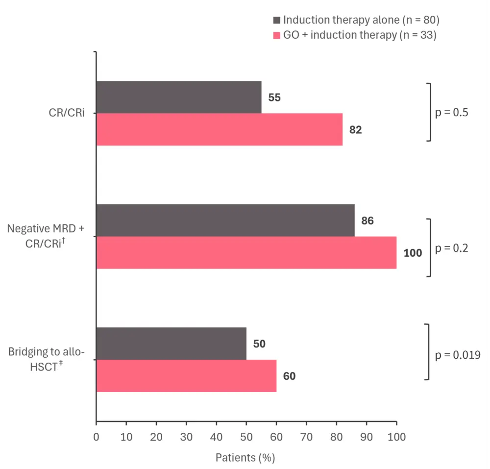 Allo-HSCT, allogenic-hematopoietic stem cell transplantation; CR, complete response; CRi, complete response with incomplete count recovery; GO, gemtuzumab ozogamicin; MRD, measurable residual disease.