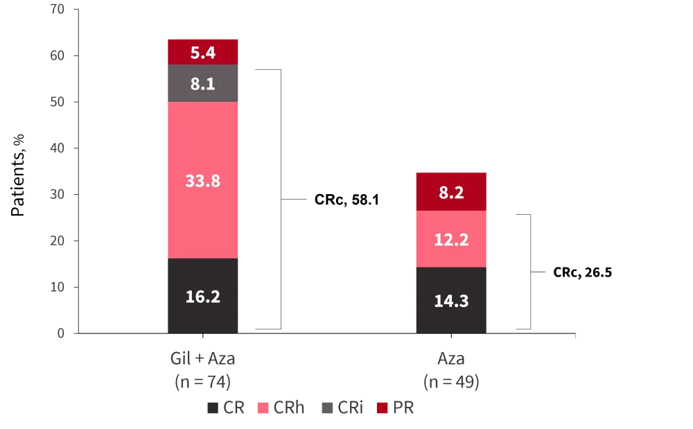 Aza, azacitidine; CR, complete remission; CRc, composite complete remission; CRh, complete remission with incomplete hematological recovery; CRi, complete remission with incomplete platelet recovery; Gil, gilteritinib.