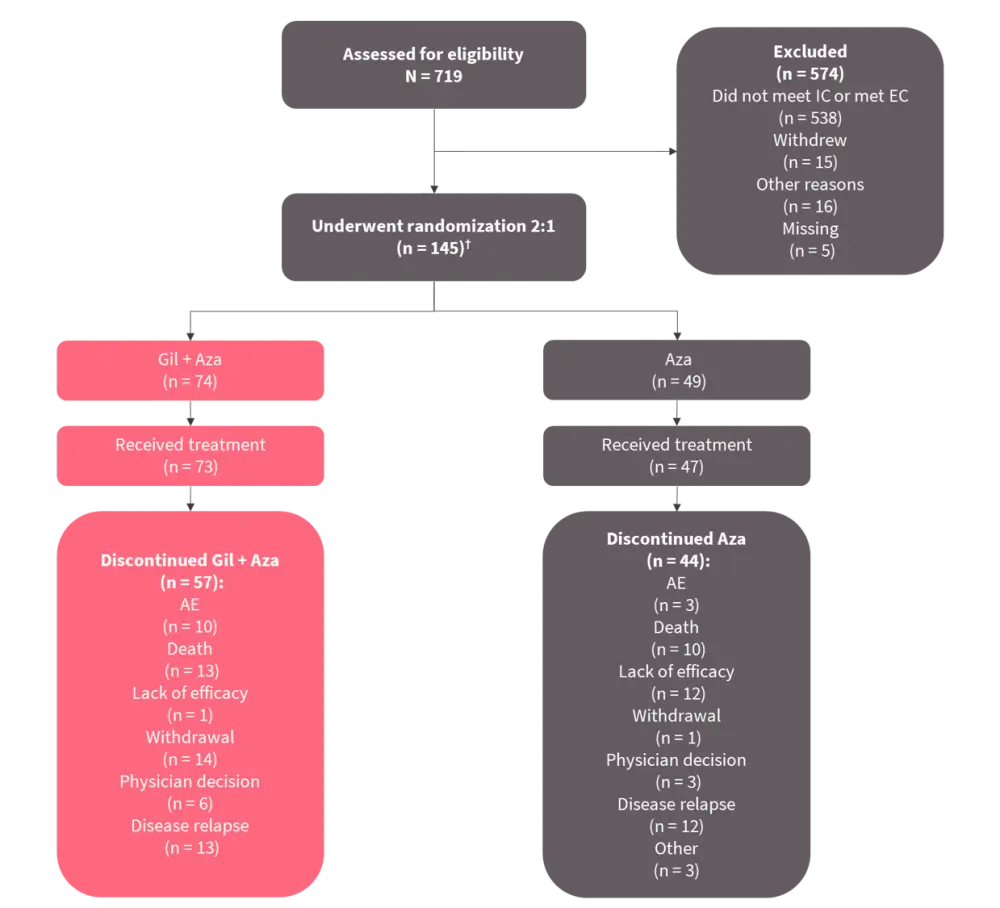 †Initially, this study included a gilteritinib monotherapy arm (n = 22), but this arm was removed due to changes in the preferred treatment for this patient population.