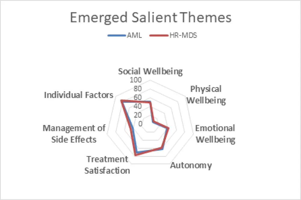 Treatment considerations regarding the quality of life (QoL) impact for patients with high-risk myelodysplastic disease (HR-MDS) and acute myelogenous leukemia (AML) are challenging due to the lack of quality data to properly inform treatment decisions. Anthony Messina, GW University’s School of Medicine & Health Sciences, Washington, DC, US, is part of the research team of a study that aims to improve how QoL is measured for patients living with MDS and AML. The purpose of the study was to explore the treatment values, goals, needs, and symptomatic experiences of patients diagnosed with HR-MDS and AML in the treatment of their condition, specifically regarding health-related QoL (HRQoL). By utilizing concept-elicitation interviews and surveys, relevant domains were identified based on the lived experience of people treated for HR-MDS and AML. A total of 17 participants (AML, n = 8; HR-MDS, n = 9) were enrolled, with both subpopulations (AML and HR-MDS) sharing similar perspectives. Seven salient themes (Social Wellbeing, Physical Wellbeing, Individual Factors, Emotional Wellbeing, Management of Side Effects, Treatment Satisfaction, and Autonomy) emerged from a thematic analysis, considering both recurrence and importance of individual codes and important and influential factors for HRQoL (Figure 1). Treatment Satisfaction, maintenance of Autonomy, and Individual Factors (such as health status, comorbidities, location of care, socioeconomic status, etc.) were found to be the most salient when discussing QoL and wellbeing.