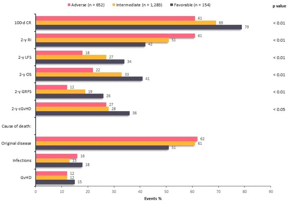 No differences were observed according to cytogenetic risk in graft failure and engraftment, or in the incidence of Grade II─IV and Grade III─IV aGvHD, chronic (c)GvHD, and NRM. The incidence of extensive cGvHD was higher in patients in the good vs intermediate vs poor risk groups (27% vs 15.7% vs 20.3; p = 0.041), but this was not confirmed in the multivariate analysis.