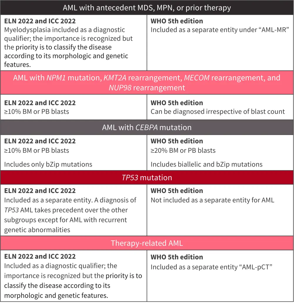 The 2022 ELN, 2022 ICC, and 5th edition of the WHO classification have several key differences, which are highlighted in Figure 1.