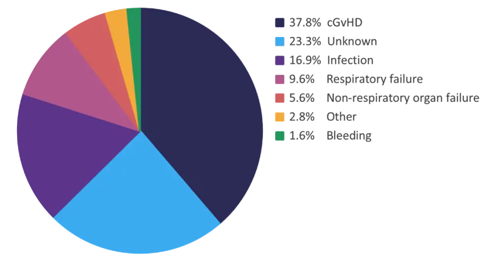 The most common cause of NRM was cGvHD-associated organ failure, infection, or additional causes not otherwise specified. The next most common causes without mention of cGvHD included infection, respiratory failure, and non-respiratory organ failure (Figure 1). The cause of death was unknown in 23% of patients.