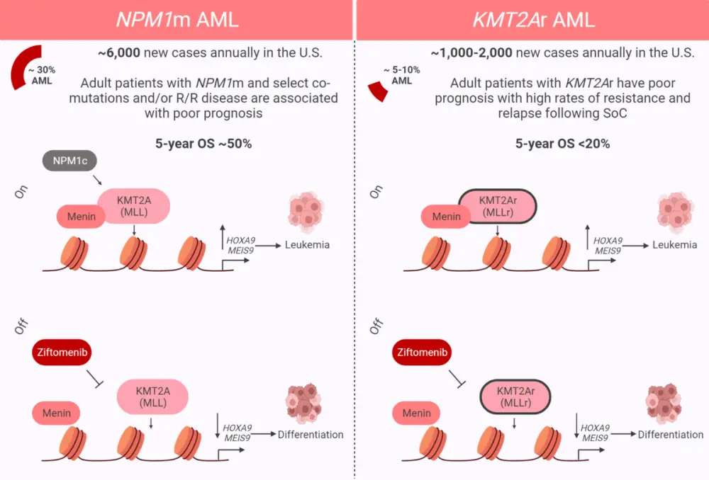 Rearrangements in the KMT2A gene (KMT2Ar) are present in 5–10% of patients in the US diagnosed with acute myeloid leukemia (AML), and mutations in NPM1 (NPM1m) occur in ~30%.1 Moreover, ~10% of patients with acute lymphoblastic leukemia (ALL) and 80% diagnosed with infant ALL have KMT2Ar.2