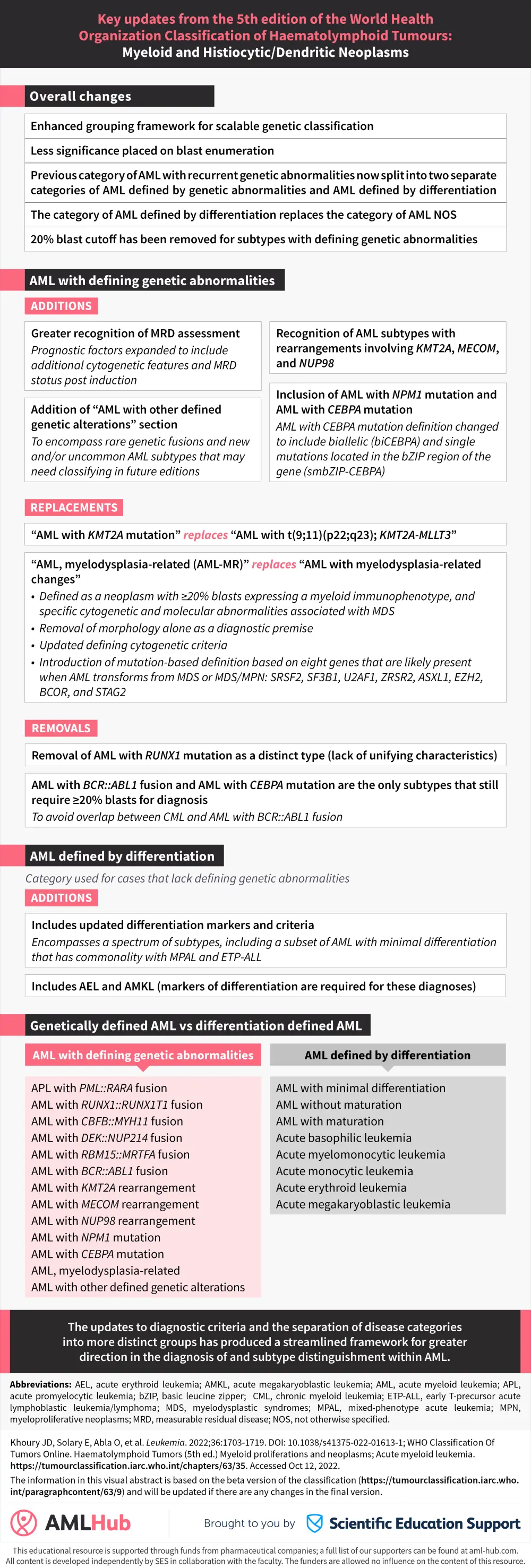 The AML Hub is pleased to present a visual abstract highlighting key updates and changes in the 5th edition of the World Health Organization Classification of Haematolymphoid Tumours: Myeloid and Histiocytic/Dendritic Neoplasms. Updates are focused on the increased separation between AML types defined by genetic abnormalities and those defined by differentiation, while still recognizing the impact and integration of clinical, molecular/genetic, and pathological factors.