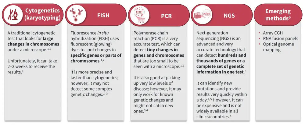 Several mutation testing methods are available, including conventional cytogenetics (karyotyping), fluorescence in situ hybridization (FISH), polymerase chain reaction (PCR), and next-generation sequencing (NGS), and these techniques continue to evolve (Figure 1).