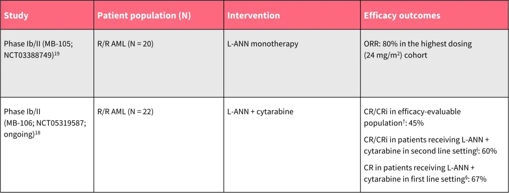 AE, adverse event; AML, acute myeloid leukemia; CR, complete remission; CRi, CR with incomplete neutrophil or platelet count recovery; L-ANN, L-annamycin; ORR, overall response rate; R/R, relapsed/refractory; TEAE, treatment-emergent AE.