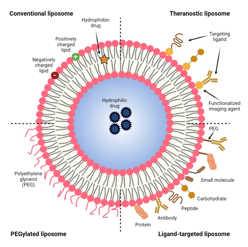 Liposomes are spherical vesicles comprising phospholipids and cholesterol in a bilayer arrangement.3,4 Due to their amphiphilic nature, liposomes are capable of delivering both hydrophobic drugs (embedded within the phospholipid bilayer) and hydrophilic drugs (encased in the core).4 Figure 1 illustrates the basic structure of liposomes and their various types, and the potential benefits of liposomes are depicted in Figure 2.