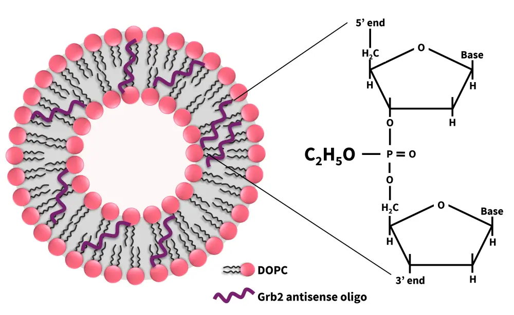 Growth factor receptor-bound protein-2 (GRB2) plays an essential role in cancer progression via the RAS activation pathway.13 Prexigebersen is a liposome-incorporated antisense oligodeoxynucleotide that targets GRB2.13 The liposomal formulation comprises of a P-ethoxy nucleic acid backbone and a neutral dioleoylphosphatidylcholine (DOPC) lipid delivery vehicle (Figure 5).14 The P-ethoxy backbone is formed by adding an ethyl group to the non-bridging oxygen atom of the phosphate bonds, producing a neutral, nuclease-resistant DNA antisense oligodeoxynucleotide that enhances its biodistribution and intracellular uptake.14