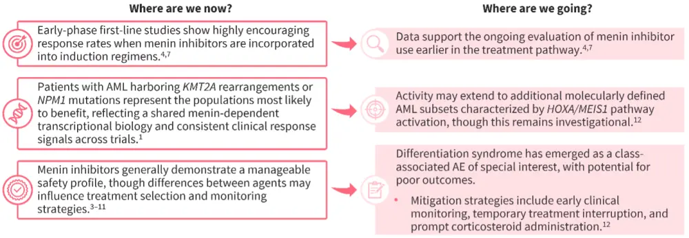 Cortes first outlined the rationale for the use of menin inhibitors in acute myeloid leukemia (AML) and their mechanism of action (Figure 1). He then provided an overview of those in development for the treatment of AML and the latest data from key clinical trials, including updates from the 67th American Society of Hematology (ASH) Annual Meeting and Exposition and the European Hematology Association (EHA) 2025 Congress (Table 1). He concluded by discussing potential future directions for menin inhibition in AML, such as their use earlier in the treatment pathway or in additional molecularly defined AML subsets, and strategies to mitigate differentiation syndrome (Figure 2).