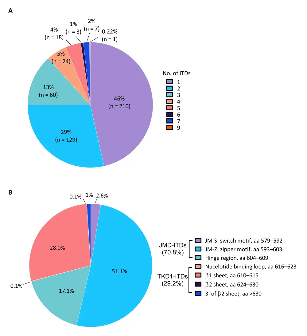 FLT3-ITD mutations are present in approximately 25% of adult patients with newly diagnosed AML and are associated with a worse prognosis, especially for patients with a high mutant to wild-type allelic ratio or those with insertions in the β1-sheet of tyrosine kinase domain 1 (TKD1). Other studies have previously shown that FLT3-ITDs in the non-juxtamembrane domain (JMD) confer resistance to a number of FLT3 inhibitors, including midostaurin, a multi-targeted protein kinase inhibitor.1