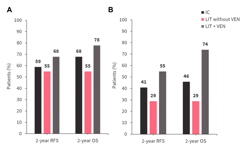 Figure 3 shows that the 2-year RFS and OS were higher in the LIT + VEN cohort compared with IC and LIT without VEN cohorts in patients with: