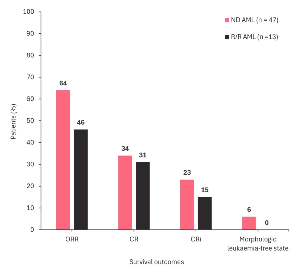 CR, complete remission; CRi, CR with incomplete count recovery; ND AML, newly diagnosed acute myeloid leukemia; ORR, overall response rate; R/R AML, relapsed/refractory acute myeloid leukemia.