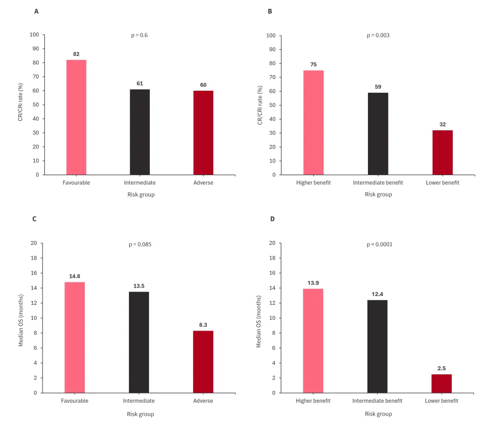 Figure 1. A ELN risk stratified CR/CRi rate, B 4-gene prognostic model stratified CR/CRi rate, C ELN risk stratified median OS, and D 4-gene prognostic model stratified median OS*
