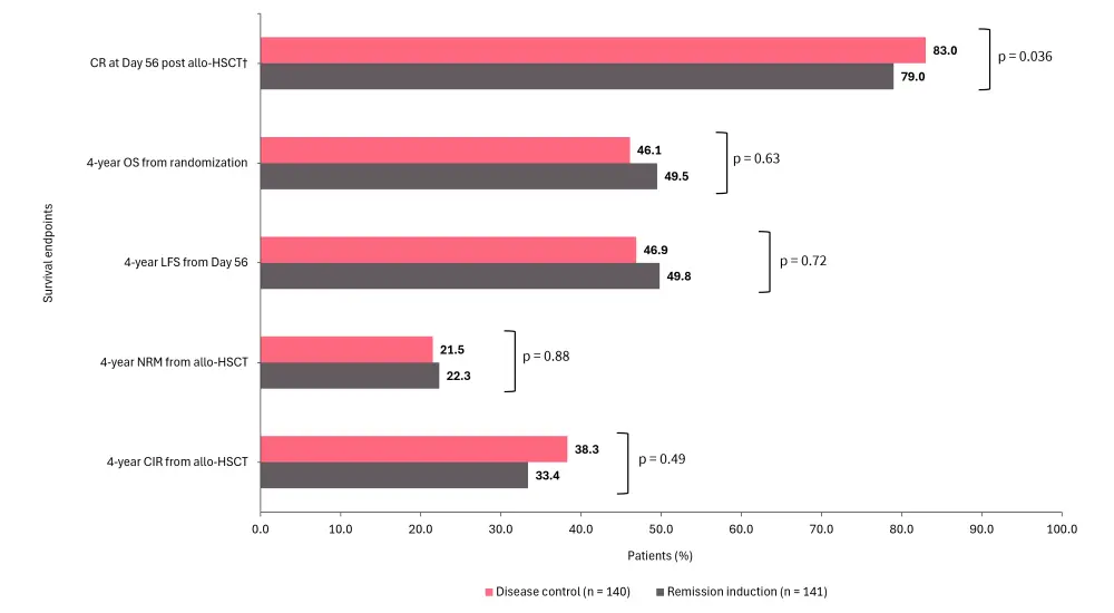 The cumulative incidence of Grade 2–4 acute graft-versus-host disease at Day 120 post HSCT was comparable between the induction remission and disease control groups in the per-protocol population (21% vs 22%, p = 0.74).
