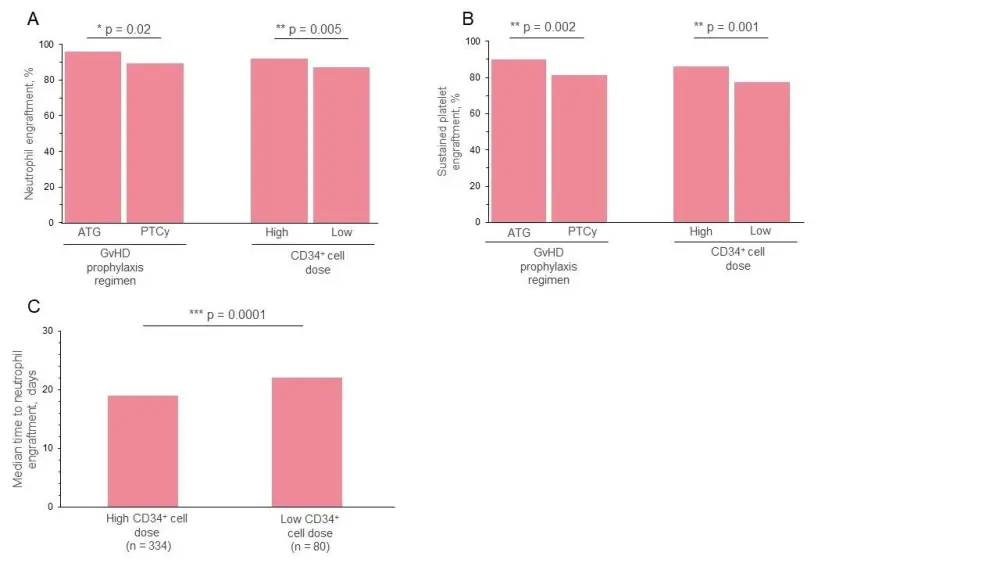 The impact of GvHD prophylaxis regimen and CD34+ cell dose on A neutrophil engraftment and B sustained platelet engraftment. C The influence of CD34+ cell dose on the time taken to reach neutrophil engraftment. Neutrophil engraftment was determined 30 days posttransplant. Sustained platelet engraftment was defined as > 20/uL at 6 months.
