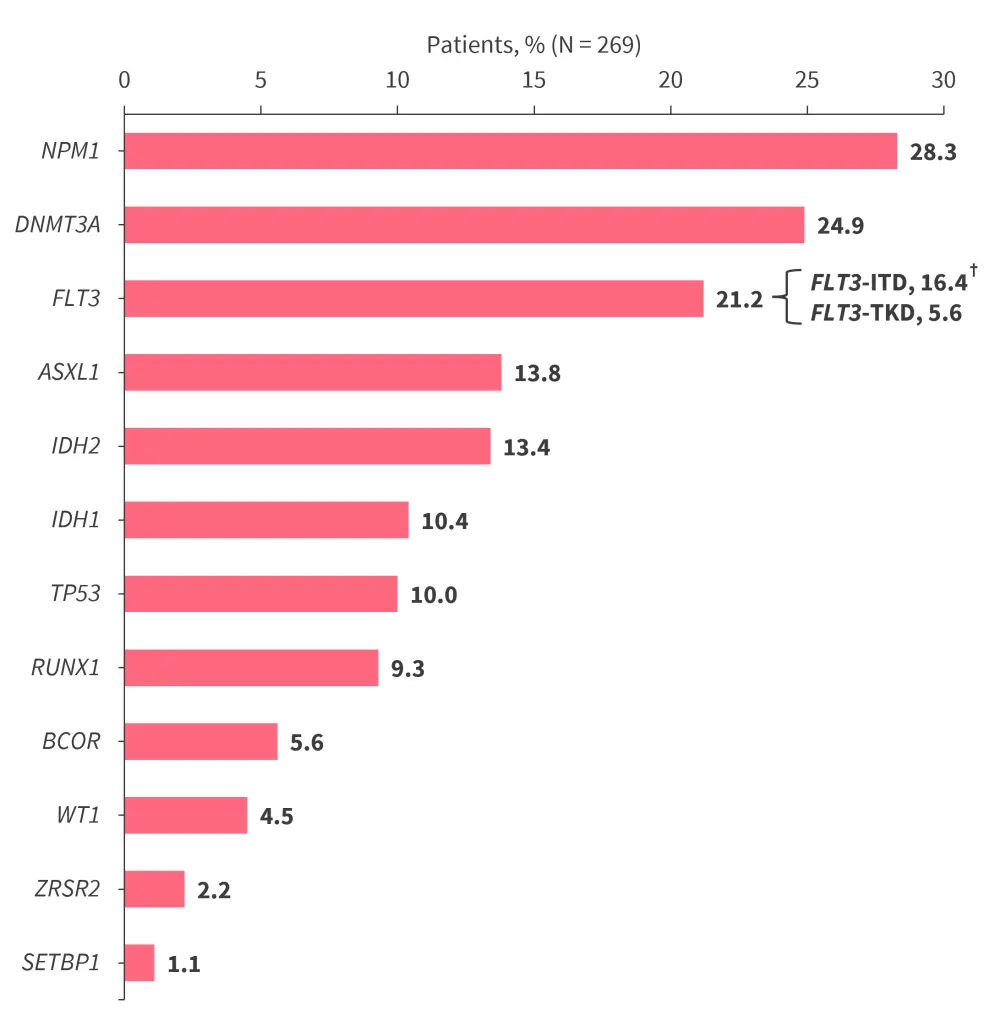 †Two patients had concomitant FLT3-ITD and FLT3-TKD mutations, giving a total percentage of patients with an FLT3 mutation of 21.2%