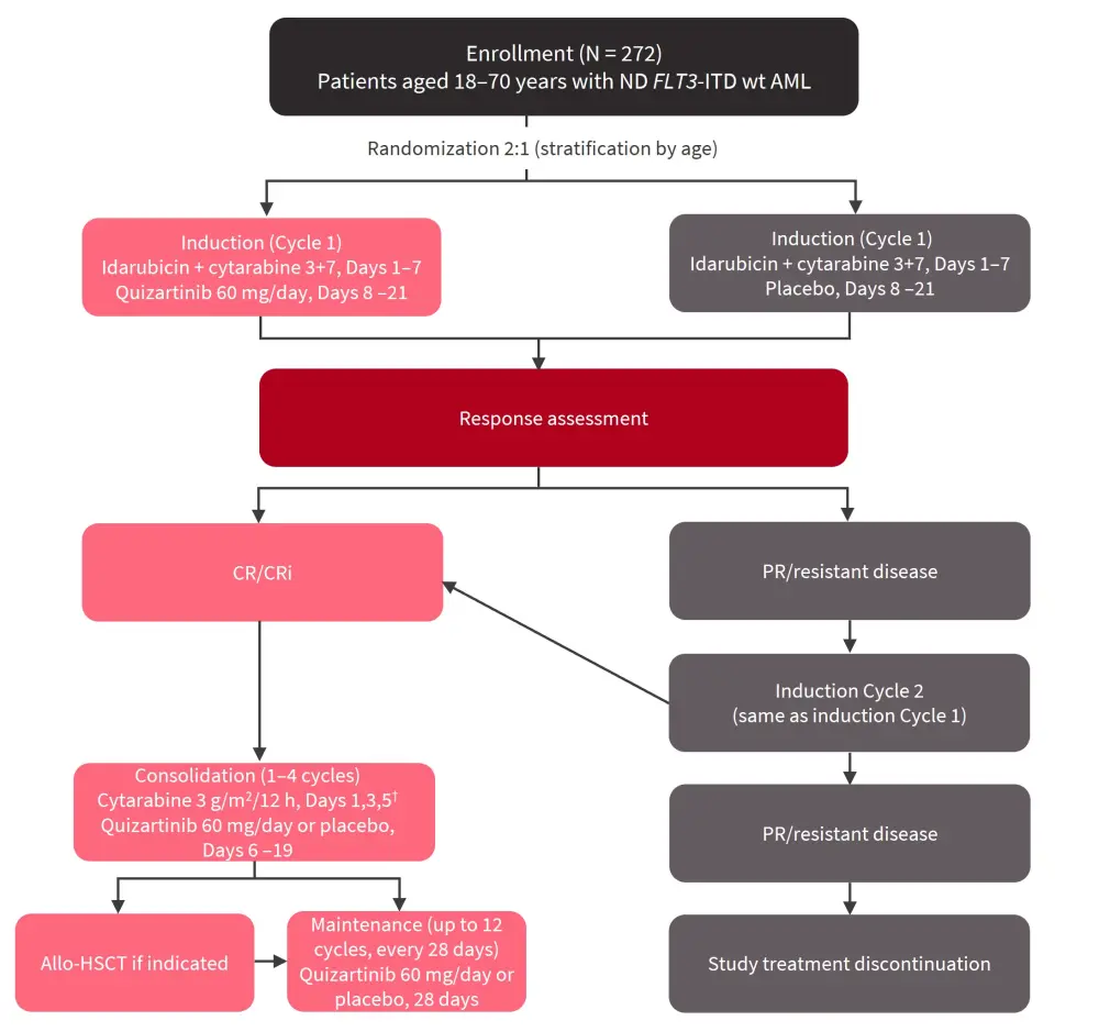 Randomized phase III trial. Induction: Cytarabine + daunorubicin or idarubicin with quizartinib 40 mg/day or placebo. Consolidation: High-dose cytarabine with quizartinib 40 mg/day or placebo. Continuation: Quizartinib 60 mg/day vs placebo |