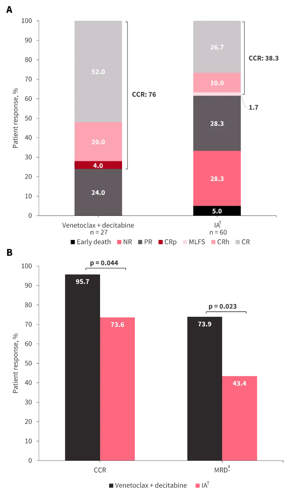 CCR, composite complete remission; CR, complete remission; CRh, CR with partial hematological recovery; CRp, CR with incomplete platelet recovery; IA, cytarabine + idarubicin; MLFS, morphologic leukemia-free state; MRD, measurable residual disease; NR, non-responder; PR, partial remission.