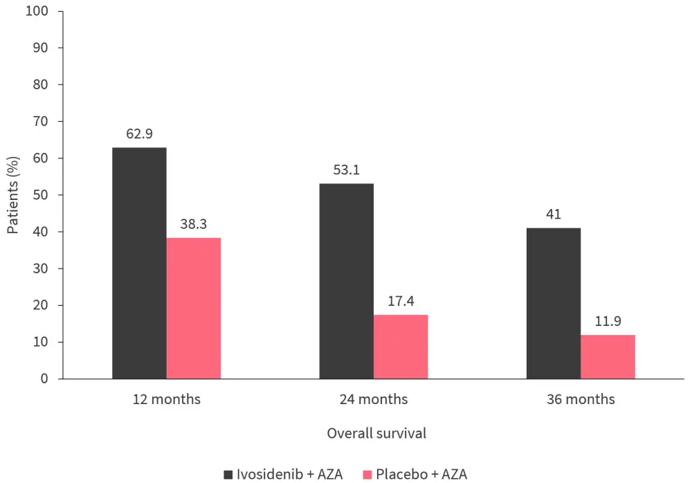 Deaths were reported in 50.7% and 77.3% of patients in the ivosidenib + AZA versus placebo + AZA arm, respectively.