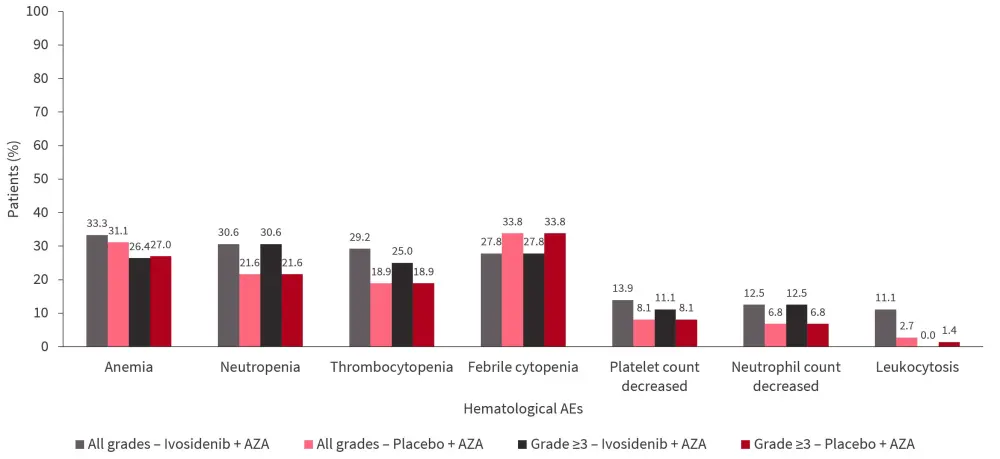 Patients in the ivosidenib + AZA arm did not show a significant increase in hematological adverse events. Fewer febrile neutropenia events occurred in the ivosidenib + AZA arm versus placebo + AZA arm (Figure 3). Grade ≥3 TEAEs occurred in 91.7% and 95.9% of patients in ivosidenib + AZA versus placebo + AZA arm. TEAEs led to dose reduction in 18.1% and 8.1% and treatment discontinuation in 26.4% and 25.7% of patients in ivosidenib + AZA versus placebo + AZA arm, respectively. Any-grade pneumonia (23.6% vs 32.4%), and infections (34.7% vs 51.4%), as well as Grade ≥3 pneumonia (22.2% vs 29.7%) and infection (22.2% vs 31.1%) were less frequent in the ivosidenib + AZA versus the placebo + AZA arm.