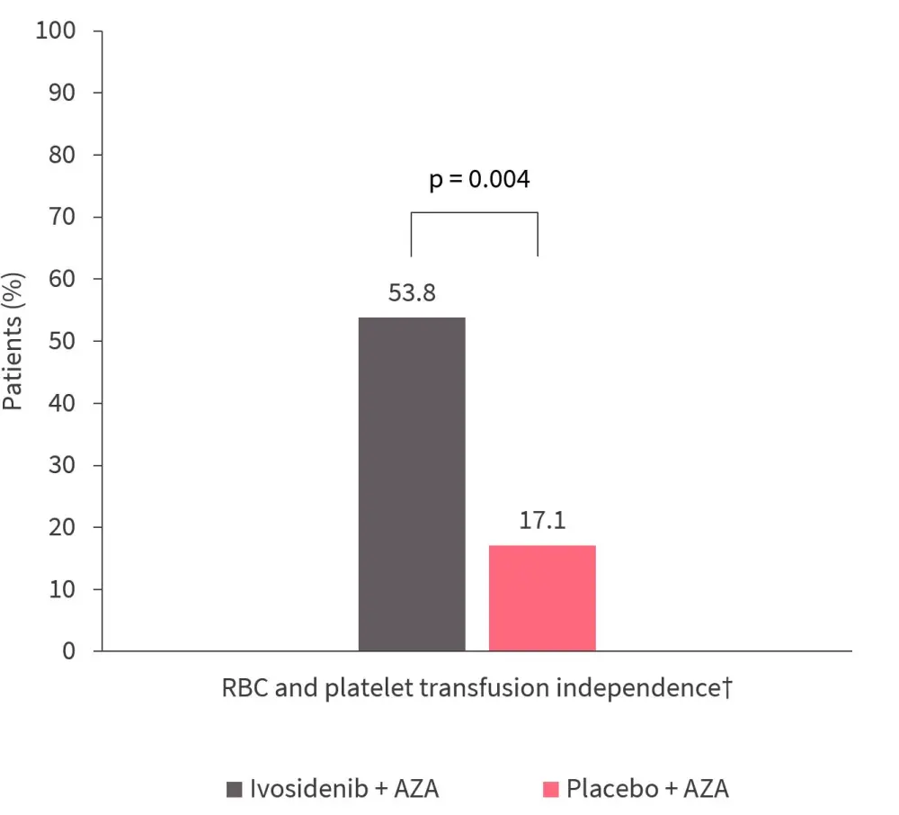 In addition, patients in the ivosidenib + AZA arm achieved a higher rate of TI compared with placebo (Figure 2). TI was also maintained in 70.6% of patients in the ivosidenib + AZA arm.