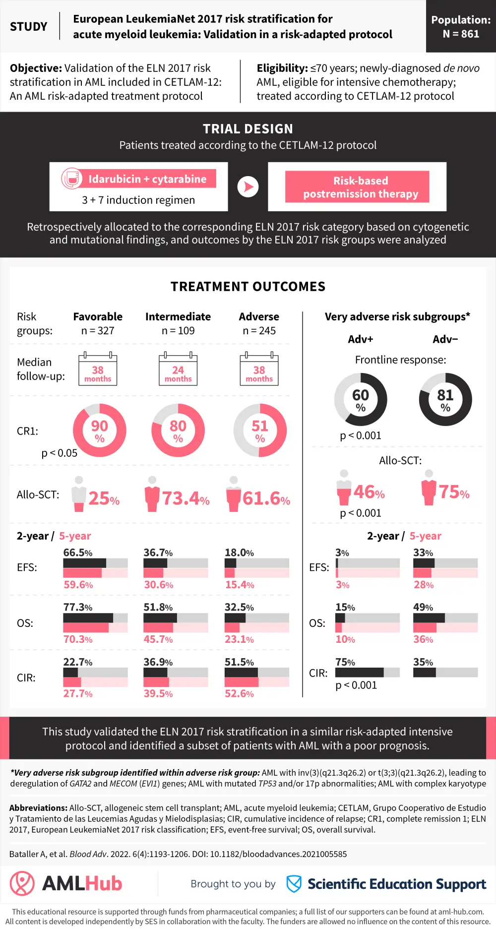 Alex Bataller and colleagues1 have attempted to validate the ELN 2017 risk classification in patients with AML who were treated according to risk-adapted post remission therapy within the Spanish AML cooperative group Cooperativo Para el Estudio y Tratamiento de las Leucemias Agudas y Mielodisplasias (CETLAM) protocol (CETLAM-12). Patients were retrospectively assigned to the corresponding ELN 2017 risk category and treatment outcomes were analyzed. The results were recently published in Blood Advances.1