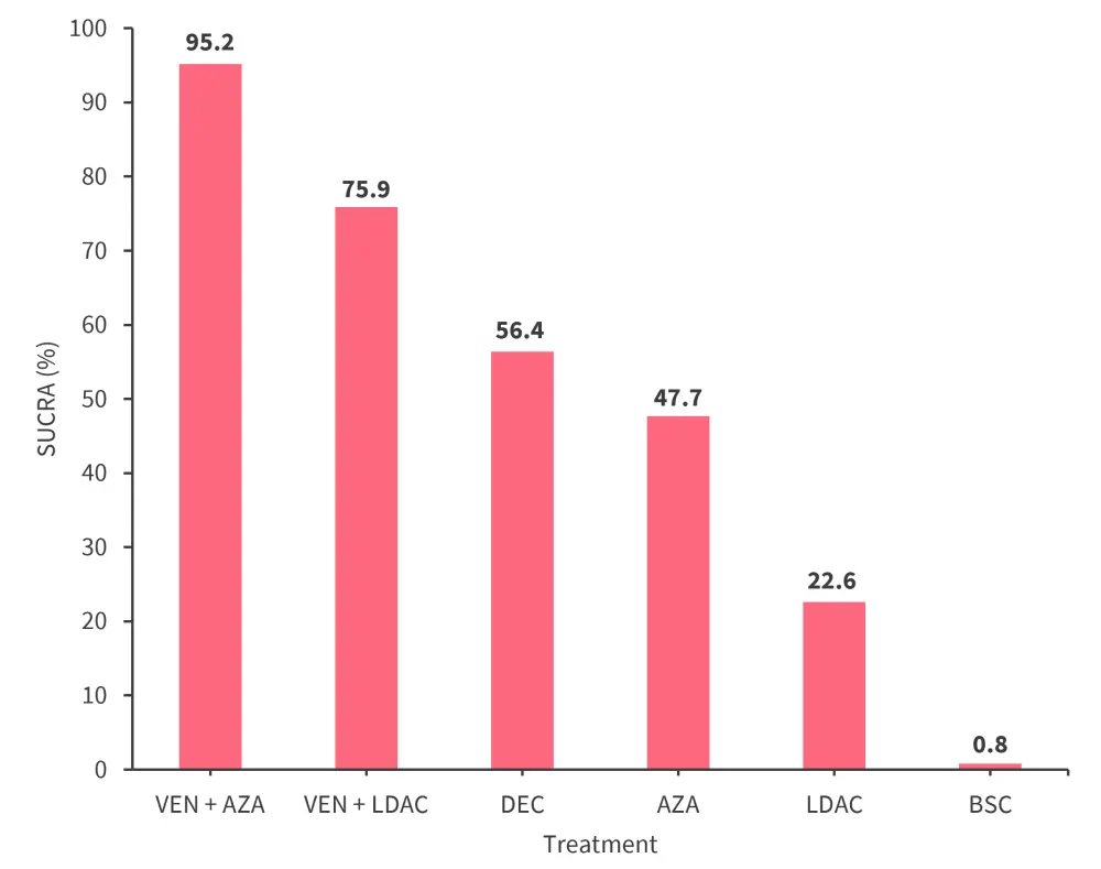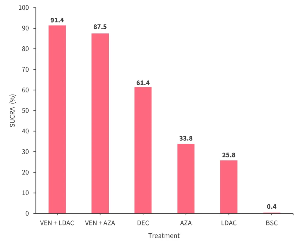 AZA, azacitidine; BSC, best supportive care; DEC, decitabine; LDAC, low-dose cytarabine; OS, overall survival; SUCRA, surface area under the cumulative ranking curve; VEN, venetoclax.