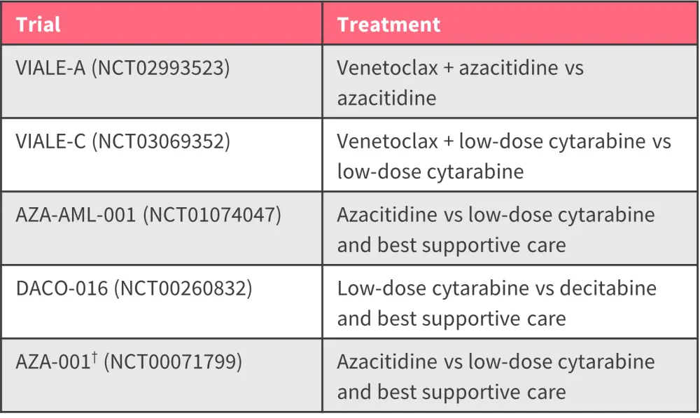 To date, there have been no head-to-head randomized controlled trials comparing the efficacy of venetoclax-based combinations with conventional treatment options in patients with AML who are ineligible for intensive chemotherapy.1 Li et al. recently published a network meta-analysis assessing the efficacy of venetoclax-based combinations compared with conventional treatment options in Value Health. Here, we summarize the key points.