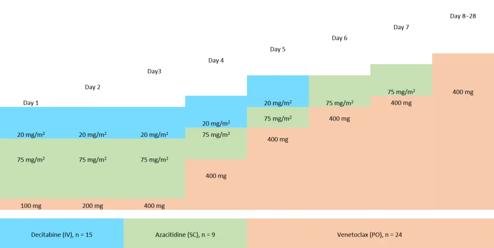 Each patient received a median of three cycles of treatment with a range of 1−19 cycles. Each cycle spanned for 28 days. All patients received venetoclax (100−400 mg) orally, while 20 mg/m2 decitabine was administrated intravenously to 15 patients, and 75mg/m2 of azacitidine was administered subcutaneously in nine patients. The treatment design and dosing schedule are presented in Figure 1.