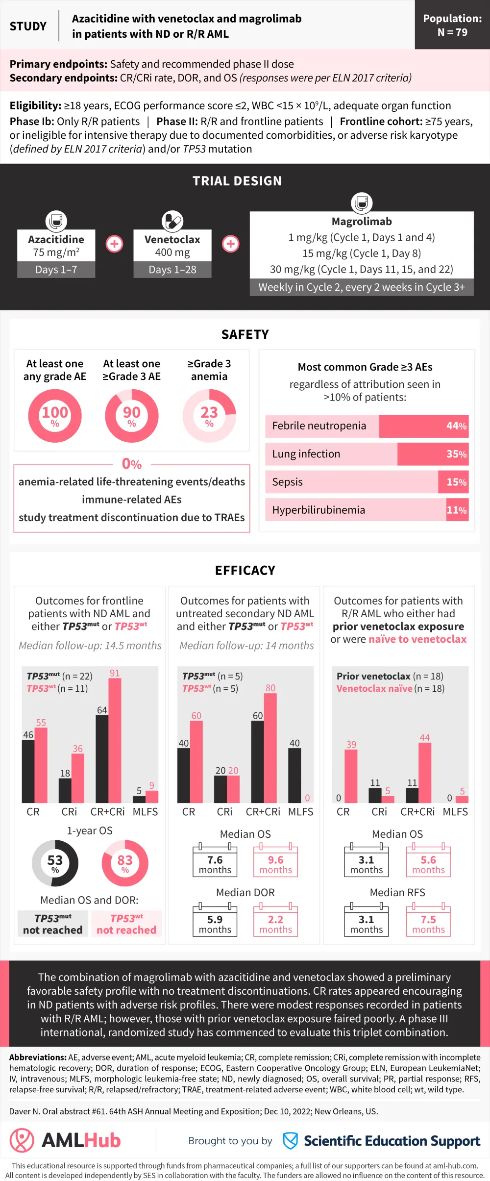 The AML Hub is pleased to present a visual abstract summarizing the key results from a phase I/II trial investigating the combination of azacitidine, venetoclax, and magrolimab for the treatment of patients with newly diagnosed or relapsed/refractory acute myeloid leukemia. These data were recently presented by Naval Daver at the 64th American Society of Hematology (ASH) Annual Meeting and Exposition and offers a rationale for further investigation of magrolimab within triplet combination therapy for patients with acute myeloid leukemia.