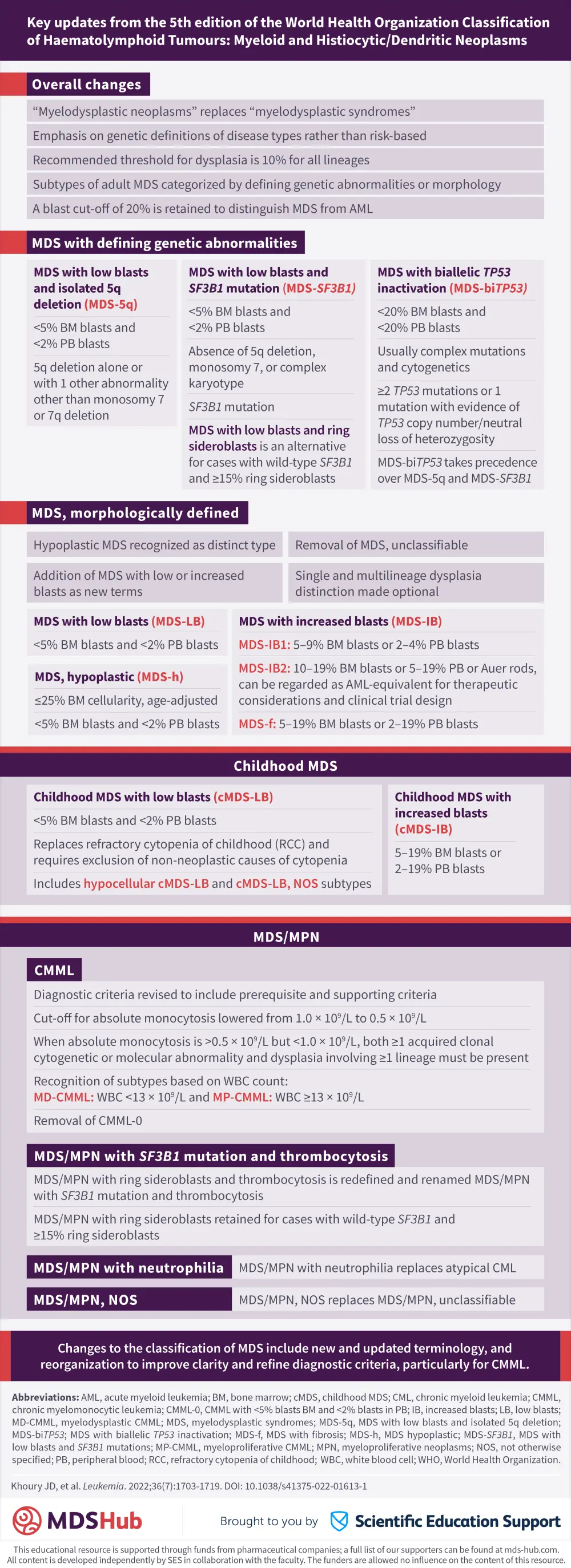 The AML Hub is pleased to present a visual abstract summarizing the key updates and changes in the 5th edition of the World Health Organization Classification of Haematolymphoid Tumours: Myeloid and Histiocytic/Dendritic Neoplasms. Updates include the grouping of myelodysplastic syndromes (MDS) entities as genetically or morphologically defined and the addition of MDS-SF3B1, MDS-5q, and MDS-biTP53 as genetically defined subtypes. Terminology describing the types of childhood MDS have been revised and the diagnostic criteria for chronic myelomonocytic leukemia have been amended.