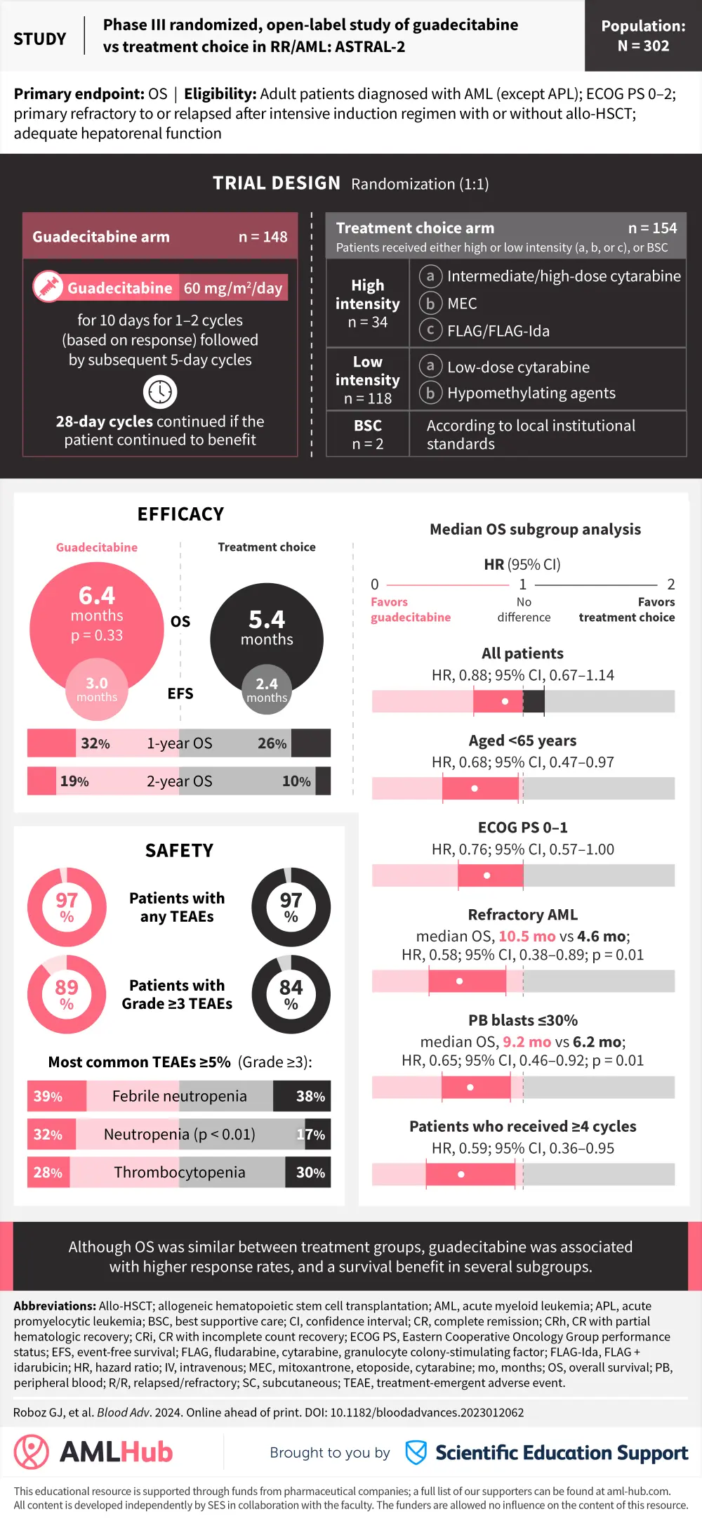 The AML Hub is pleased to present a visual abstract summarizing results from the phase III ASTRAL-2 trial (NCT02920008) assessing guadecitabine, a next-generation hypomethylating agent vs standard-of-care treatment in patients with relapsed/refractory acute myeloid leukemia. Results from this trial were published by Roboz et al.1 in Blood Advances.