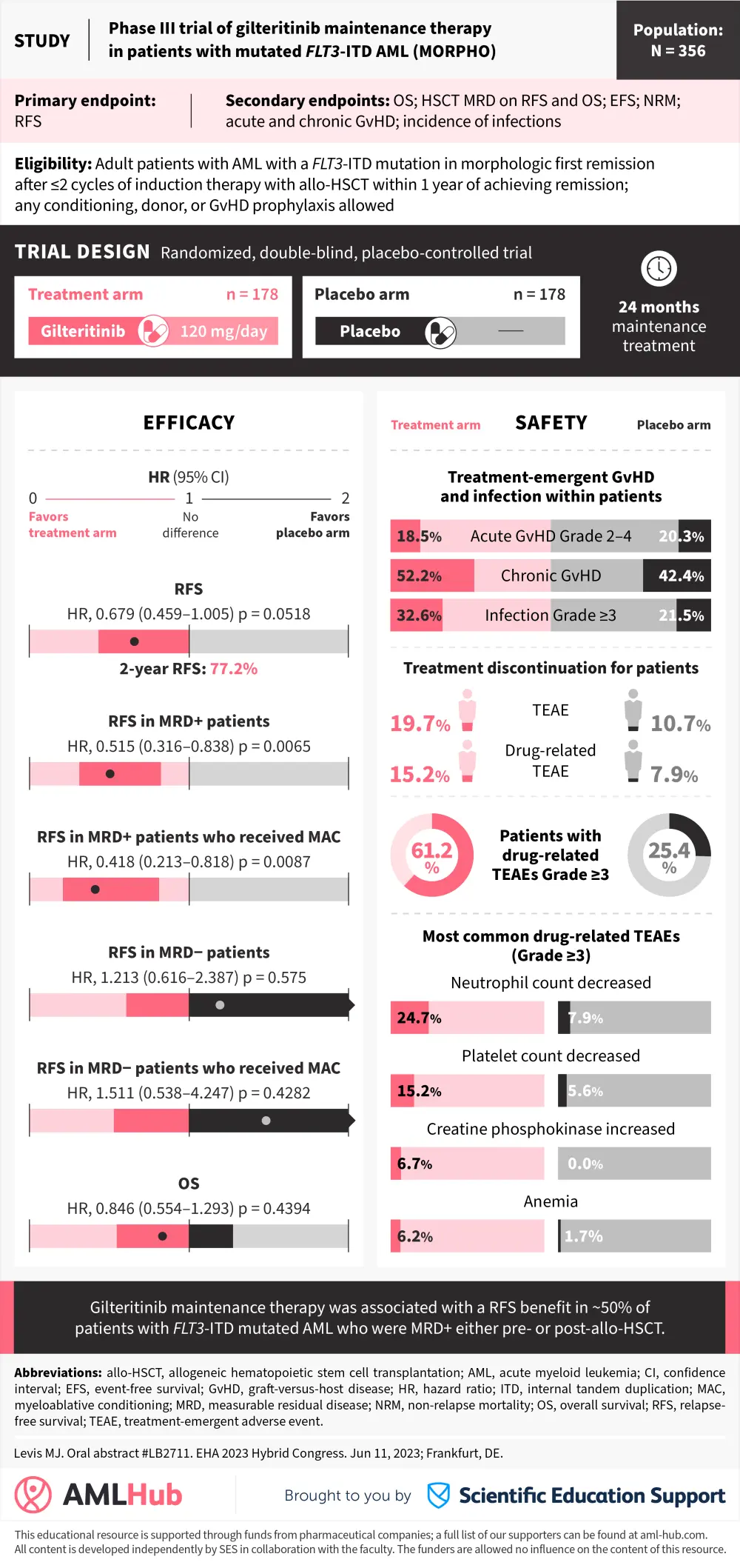 The AML Hub is pleased to present a visual abstract summarizing the key results from the phase III randomized placebo-controlled MORPHO trial (NCT02997202) evaluating gilteritinib as a maintenance therapy in patients with FLT3-internal tandem duplication (ITD) acute myeloid leukemia following allogeneic hematopoietic stem cell transplantation in first remission.1