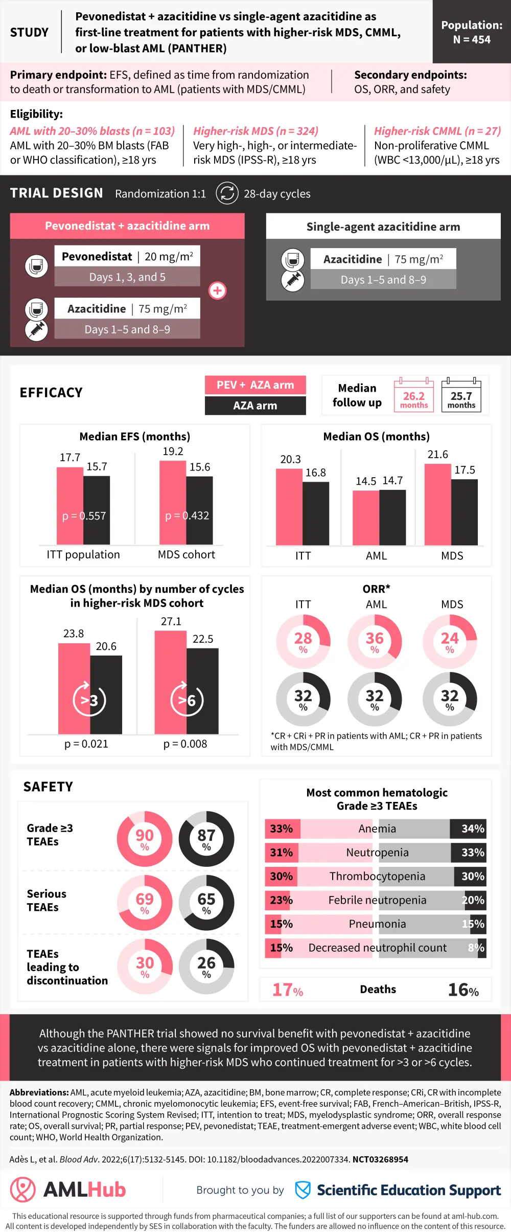 The AML Hub is happy to present a visual abstract representing key findings from the phase III PANTHER trial (NCT03268954) evaluating the efficacy and safety of pevonedistat + azacitidine vs azacitidine alone in patients with higher-risk myelodysplastic syndromes and low-blast-percentage acute myeloid leukemia.